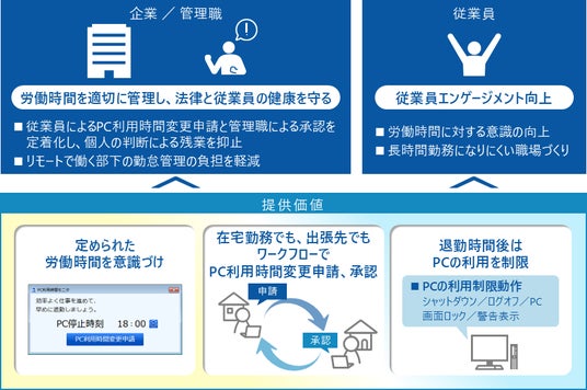 株式会社日立ソリューションズ(本社:東京都品川区、取締役社長:森田 英嗣/以下、日立ソリューションズ)は、従業員による残業申請と管理職による承認を定着化し、退勤時間後のPC利用制限を行うことで、働き方に関する意識変革を促す「PC自動シャットダウンサービス」を、8月31日から販売開始します。