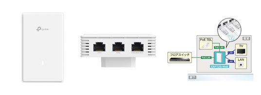ホテルを中心に多数採用されている壁面取り付け型モデル。4つのポート(アップリンク×1+ダウンリンク×3)のうち、ダウンリンクポートの1つはPoEパススルーに対応しているため、VoIP電話のような有線デバイスを追加電源なしで給電・通信させることができます。