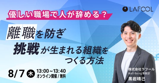 人的資本/ウェルビーイング経営支援の株式会社ラフール(本社:東京都中央区、代表取締役社長:結木啓太 以下「ラフール」)は、2025年8月7日(木)に 優しい職場で人が辞める?離職を防ぎ、挑戦が生まれる組織をつくる方法 をテーマとしたセミナーを開催いたします。