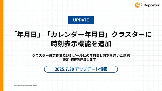 株式会社シムトップス(本社:東京都品川区、代表取締役社長:水野貴司)が提供する現場帳票システム「i-Reporter(アイレポーター)」は、年月日クラスターおよびカレンダー年月日クラスターに時刻表示機能を追加する機能拡張を実施いたします。