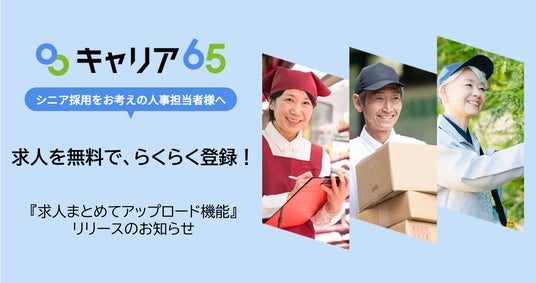 シニア人材に特化した求人サイト「キャリア65」(運営:合同会社福祉人事/東京都港区)は、2025年7月、新たに「求人まとめてアップロード機能」をリリースいたしました。これにより、複数の求人情報をまとめて効率的に登録できる環境を整え、掲載企業の業務負担を軽減するとともに、サイト上でのシニア人材と求人掲載企業のマッチング促進を目指します。