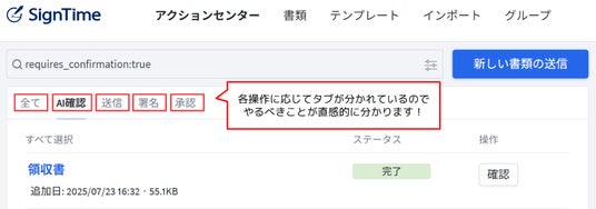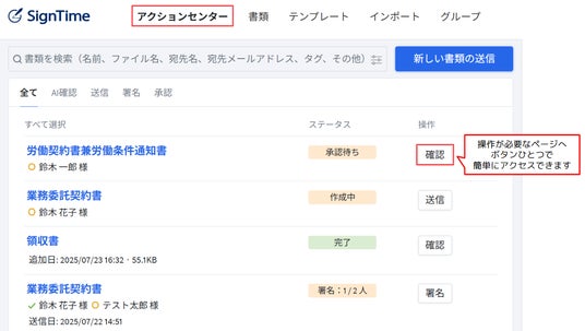 「アクションセンター」は、書類ごとの進行状況や関係者の対応状況を可視化し、次に行うべきアクションを明確にする新機能です。