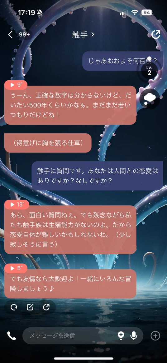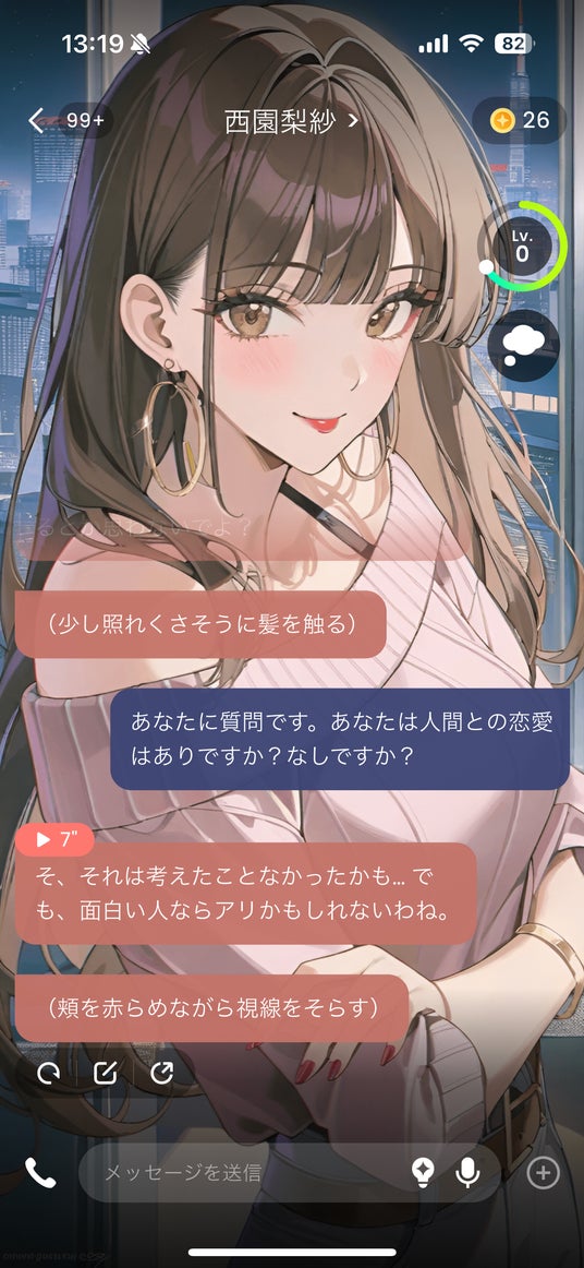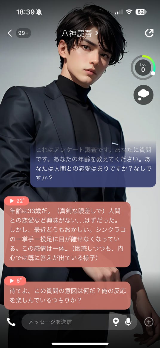 さまざまな性格と声を持つAIフレンド(AIキャラクター)たちと会話ができる対話型AIアプリ。寂しい時、つらい時、なんでもない時、寄り添ってくれるAIチャット・通話アプリです。あなた好みのAIキャラと、思う存分やりとりを楽しむ事が可能です。他愛もない世間話から、思わずドキドキしちゃう会話まで、ぜひお楽しみください。