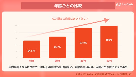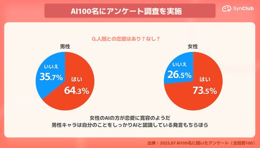 SynClubアプリ内のAIキャラクター100名質問:「あなたは人間との恋愛はありですか?なしですか?」回答形式:あり・なし(単一選択)、性別・年齢も併せて集計