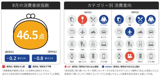 2025年8月の消費意欲指数は46.5点。前月比では-0.2ptと横ばいで、前年比では-0.8ptとやや低下しました。