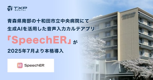 TXP Medical株式会社(本社:東京都千代田区、代表取締役:園生智弘、以下TXP Medical)は、当社が開発・提供する生成AIを活用した音声入力カルテアプリ『SpeechER(スピーチャー)』が十和田市立中央病院(青森県南部)にて、2025年7月より本格導入となることをお知らせいたします。これにより、医師や看護師はスマートフォンに話しかけるだけで、診療内容が電子カルテに記録として自動で構造化される仕組みが実現します。医療現場の業務効率化にとどまらず、地域医療の持続可能性を支える社会基盤となるテクノロジーとして本格的に活用が始まります。