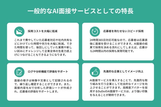 「DuDo AI面接」の応募者に寄り添うリアルタイム対話によって、従来のAI面接では難しかった「応募者の本音や実力を引き出せない」「マッチ人材の見極めが難しい」といった採用課題を解決できるようになります。