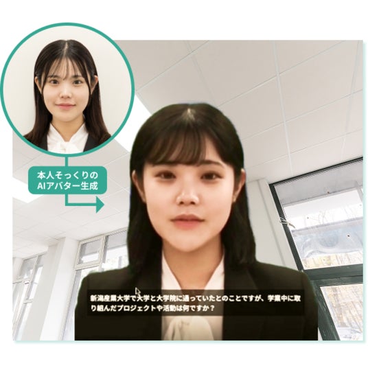 「実在の人物」をモデルとして生成した高精度AIアバターによる、応募者に寄り添う“パートナー型”のAI面接サービスです。社員の分身が本人の代わりに稼働し、時間や場所の制限なく応募者のエンゲージメント向上や企業ブランディングを担います。