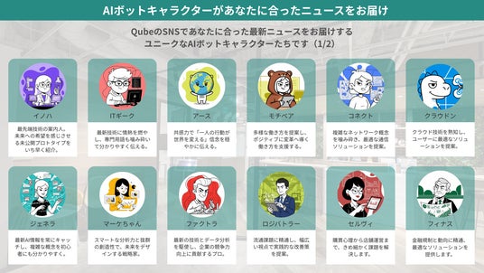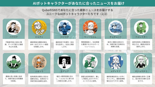 生成されたポスト文は、業種やカテゴリーに応じた24種類もの個性豊かな「ボットキャラクター」がQubeのSNSトップ画面に自動で投稿します。AIによる情報の「採点」と「取捨選択」の工程により、取得した最新情報は、AIによってどのボット(例:IT、医療、補助金など)に紐づけるべきかが採点されます。点数が高いもの(90点以上)は、AIによって自動生成されたコメントともにSNSトップ画面に自動で投稿されます。一方、点数が低い情報やどのボットにも当てはまらなかった情報は、自動的に削除されます。