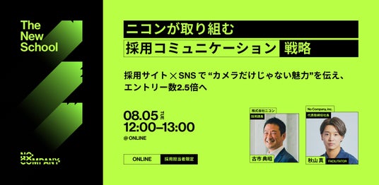 企業の人事部門向けに採用マーケティング支援を行う株式会社No Company(本社:東京都港区、代表取締役:秋山真)は、株式会社ニコン 経営管理本部 人事部・採用課長の古市氏をゲストにお迎えし、人事・採用担当者向け共創型コミュニティ【 The New School 】のオンラインセミナーを8月5日(火)に開催します。