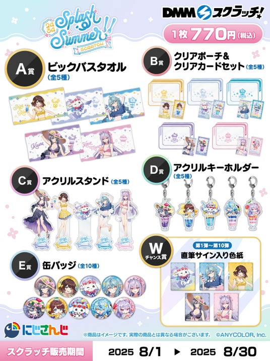 合同会社DMM.com(本社:東京都港区、会長 兼 CEO亀山敬司、https://dmm-corp.com/ 以下DMM )は、ハズレなしのオンラインくじサービス「DMMスクラッチ」にて、2025年8月1日(金)より『にじさんじ「Splash Summer!!」 スクラッチ』を販売することをお知らせいたします。本くじでは、DMMスクラッチ限定の多彩なラインナップと共に、ライバーの直筆サイン入り色紙が抽せんで当たるWチャンス賞を計30日間開催いたします。