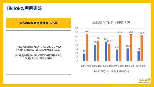 TikTokは一般的に「若い世代ほど浸透している」というイメージがあるように見えますが、実際のところ15-17歳の世代よりも22-25歳世代がより活発な利用層(毎日利用率47.5%)であることが判明しました。