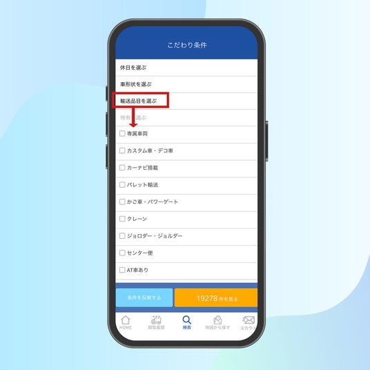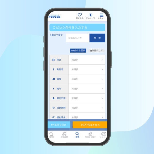 ユーザーの皆様にご好評いただいている「こだわり検索機能」がアプリでも利用可能になりました。車種や特徴、出勤時間や給与はもちろん、ドライバーならではの車形状、輸送品目など、多岐にわたる項目から細かく条件を絞り込み、ご自身の希望に合致する求人を効率的に見つけることができます。選択した条件は「MY条件」として保存できるため、次回以降の検索もスムーズです。