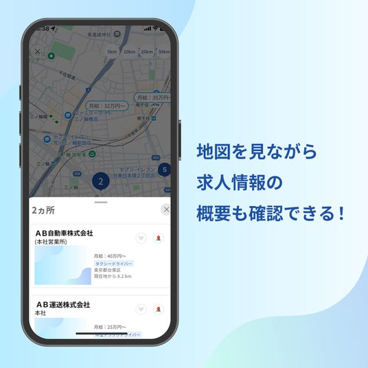 求職者の動向を分析する中で行った弊社のアンケートでは、約89.5%のドライバーが転職先を選ぶ上で「場所」と「給与」を重視していることが明らかになりました。今回の新アプリではこのニーズに応えるべく、アプリ上で地図を開くだけで、希望の勤務地周辺の求人情報と給与を視覚的に把握できる地図検索機能を実装しました。ユーザーは現在地周辺はもちろん、任意の場所を指定して、求人情報を簡単に探すことができるようになりました。これにより、通勤時間や生活圏を考慮した仕事探しが可能になります。地図上では求人の件数が表示されるほか、拡大すると月給も確認できます。