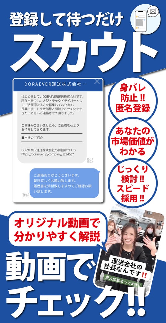 ドラEVERは、2017年の会社創業時よりドライバー専門の求人サイトとして、全国のドライバーの皆様と運送企業を繋ぐプラットフォームを提供してまいりました。現在では、運送業界のDX化に特に力を入れており、求人サイト運営で培ったノウハウを活かし、運送業向けの基幹システム「運SOUL(ウンソウル)」の開発・提供を通じて、業界全体のDX化・生産性向上・人材確保の支援、そして持続可能な発展に貢献してまいります。【本件に関するお問い合わせ先】