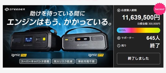 クラウドファンディング「Makuake」で実施したスーパーキャパシタ搭載ジャンプスターター「Ignic (イグニック)」プロジェクトが達成率3,879%超・応援支持購入者数645人という当初の予定数を超える大成功を収めたことをお知らせします。