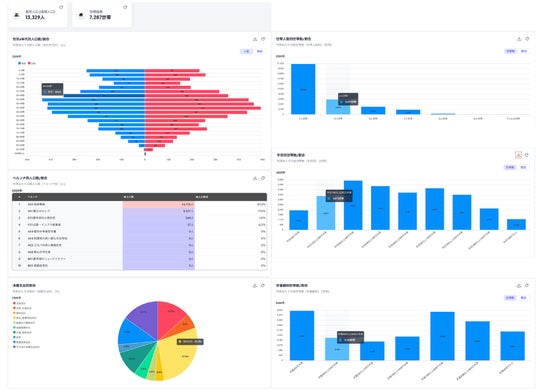 お客さまが選択したエリア内の居住者の傾向を、公的統計データに基づいてさまざまな視点からグラフで可視化できる「公的統計分析機能」を追加しました。