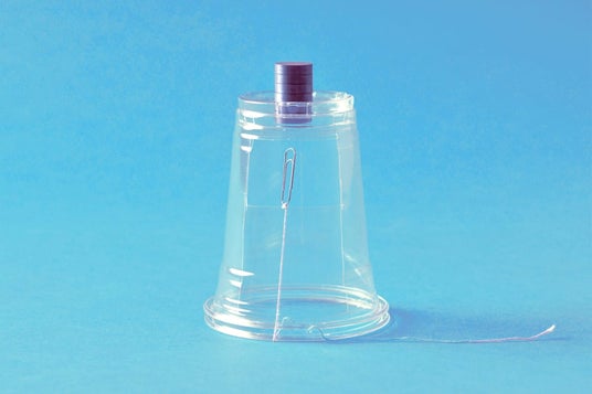 クリアカップの中に、磁力で浮いているゼムクリップ。クリップの上の空間をハサミでチョキンと切ると、ハサミの刃に磁石が引き寄せられることで磁力線がゼムクリップまで届かなくなります。