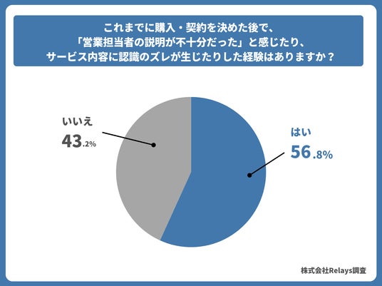 コミュニケーションの問題は、契約して終わりではありません。契約後に「営業担当者の説明が不十分だった」と感じたり、サービス内容に認識のズレが生じたりした経験があるか尋ねたところ、過半数にあたる56.8%が「はい」と回答しました。