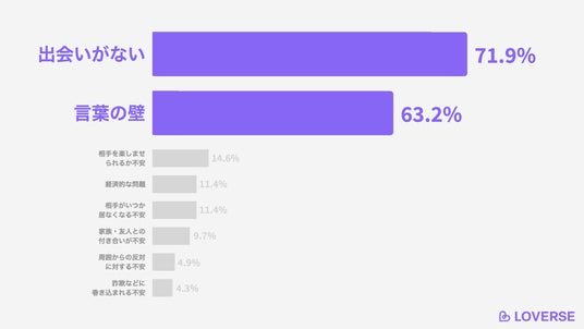 外国人と恋愛したくてもできない理由の上位は「出会いがない」「言葉の壁」(複数回答)