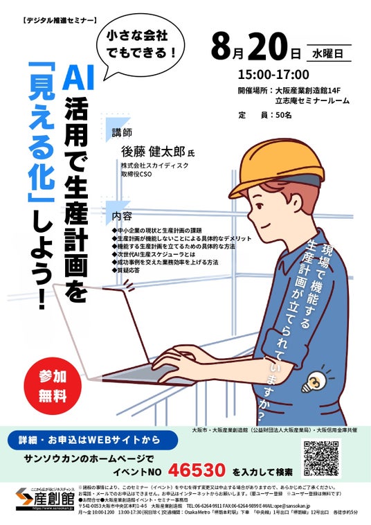 株式会社スカイディスク(本社:福岡県福岡市中央区、代表取締役CEO:内村 安里、以下「スカイディスク」)は、大阪産業創造館・大阪信用金庫共催の『【デジタル推進セミナー】小さな会社でもできる!AI活用で生産計画を「見える化」しよう!』に登壇いたします。