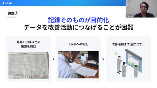デスクレスワーカー向け現場支援システムtebikiを提供するTebiki株式会社(本社:東京都新宿区、代表取締役:貴山敬 / 以下、Tebiki)は、2025年6月25日(水)に「製造業におけるデジタル帳票活用」をテーマにしたオンラインイベントを初めて開催しました。Tebikiが提供するデジタル現場帳票サービス「tebiki現場分析」のユーザー企業である株式会社日本電気化学工業所(本社:大阪府豊中市、代表取締役社長:倉智真平 / 以下、NACL)の長崎雅史氏が登壇し、デジタル帳票の活用による品質不良の未然防止への取り組みについて解説しました。