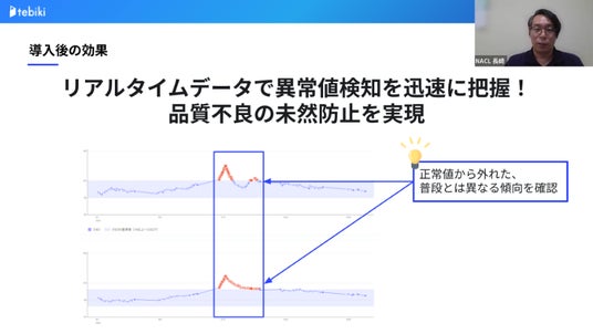 処理時の熱により液温が管理範囲を超えて上昇した際に、即座にアラートが発報。週の始めに冷却液バルブの開け忘れが発生していたことを特定し、従来であれば不良品発生まで気づかなかった問題を早期発見し、迅速な現場対応により品質トラブルを未然に防止できたという事例も紹介していただきました。