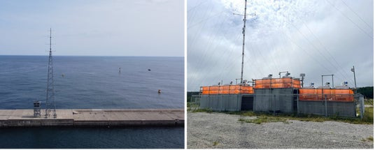 むつ小川原洋上風況観測試験サイトにおけるライダー機器の観測の様子(左:洋上サイトのフローティングライダー、右:陸上サイトのスキャニングライダー)