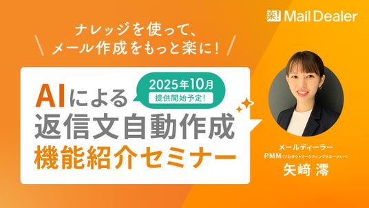 株式会社ラクス(本社:東京都渋谷区、代表取締役:中村 崇則)が提供する問い合わせ管理システム「メールディーラー」は、2025年8月7日(木)11時より、メールでお問い合わせ対応をされている部署の責任者様・ご担当者様向けにオンラインセミナー「AIによる返信文自動作成機能紹介セミナー」を開催いたします。