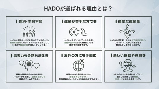 また、HADOは対戦型のチームスポーツであることから、自然と会話や思考が生まれ、チームビルディングや社員間の交流を促進します。操作も直感的でわかりやすく、英語にも対応しているため、海外拠点や多国籍チームを含む企業でも安心して導入できます。