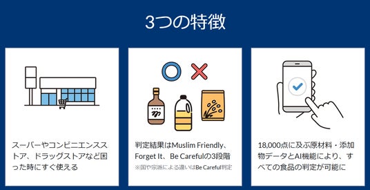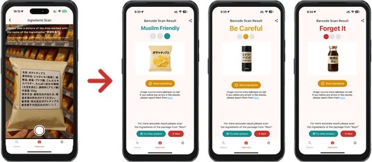 日本最大級のムスリム向けレストラン情報アプリ「Halal Gourmet Japan」(ハラールグルメジャパン)で提供された新サービス「Halal Lens」は、スマートフォンを使って商品のバーコードや原材料表示を読み取り、ハラールの観点からすべての成分を”OK”、”NG”、”グレー”の3段階に色付けします。観光や仕事で日本を訪れるムスリムの方々がムスリムフレンドリーな商品を探す不便さを解消し、日本語がわからなくても安心して買い物を楽しむことができます。