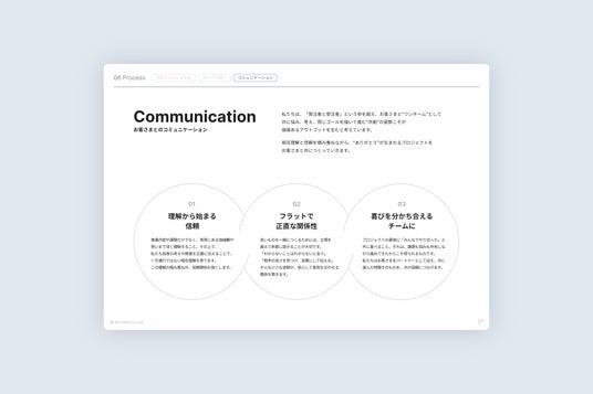 ご依頼の決め手として最も重要な「安心感」を醸成するため、「発注者と受注者」という枠を超え、お客さまを自社を最もよく知る“プロフェッショナル”としてチームにお迎えするという私たちの思想を全面的に反映しました。フラットな関係性で率直に意見を交わしながら 、共にプロジェクトの成功を目指す“共創”のプロセスを実感いただける構成になっています。