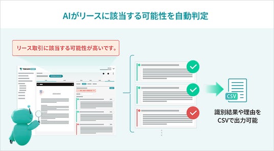 「TOKIUM AI新リース判定」は、AIがリースの識別をサポートし、リース識別にかかる工数を大幅に削減します。AIの活用により、「実質リース」の見落としや識別の判断ミスなどのリスクを抑制することができます。また、各リース資産管理システムのフォーマットに合わせて、判定結果をCSVで出力できるため、システムへのデータ連携も容易になります。
