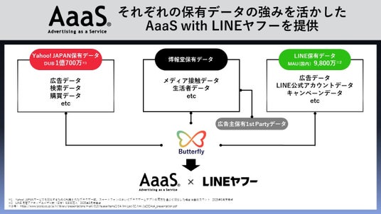 博報堂は、企業のマーケティングニーズとユーザープライバシー保護を両立させたデータ活用手法として、旧LINE株式会社と共同で「LINE DATA SOLUTION」(※1)を推進し、旧ヤフー株式会社とは2022年に共同分析プロジェクト「Cocoon」(※2)を立ち上げ、広告主の顧客像の分析や広告効果の可視化に取り組んでまいりました。今回の協業により発足した「Butterfly project」という名称には「Cocoonからの進化」、「マーケティングの未来を切り開く」という意味が込められています。なお、博報堂は、2021年からセキュアにデータの突合・分析ができる環境の活用を各プラットフォーマと推進し、多種多様な企業への分析やコンサルテーションの実績があります。今回提供を開始した「AaaS with LINEヤフー」の基盤となる「Butterfly project」においても、これらの実績から得た知見やノウハウを活用することで、マーケティングフルファネルを統合したプラニングを可能にする機能を順次拡張し、企業の効果的なマーケティング活動と持続的な事業成長に貢献してまいります。