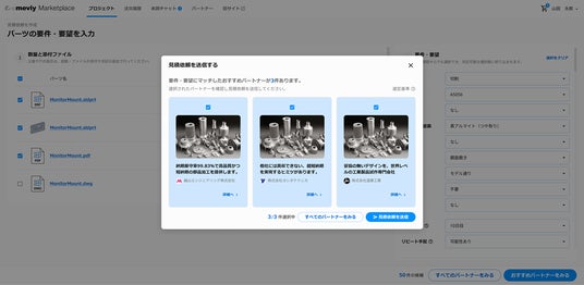 日本最大級の製造業マーケットプレイス「meviy(メビー)マーケットプレイス」(サービス提供元:株式会社ミスミグループ本社)は、7月31日よりAIマッチング機能を強化し、パートナーの選定を容易にする「パートナーおまかせ絞り込み機能」をリリースします。部品のモデル形状や材質、納期などの情報からAIが最適なパートナーを最大3社まで提案します。これにより、複数のパートナーの中から最適なパートナーを迷わず選択できるようになり、お客さまの利便性が向上します。
