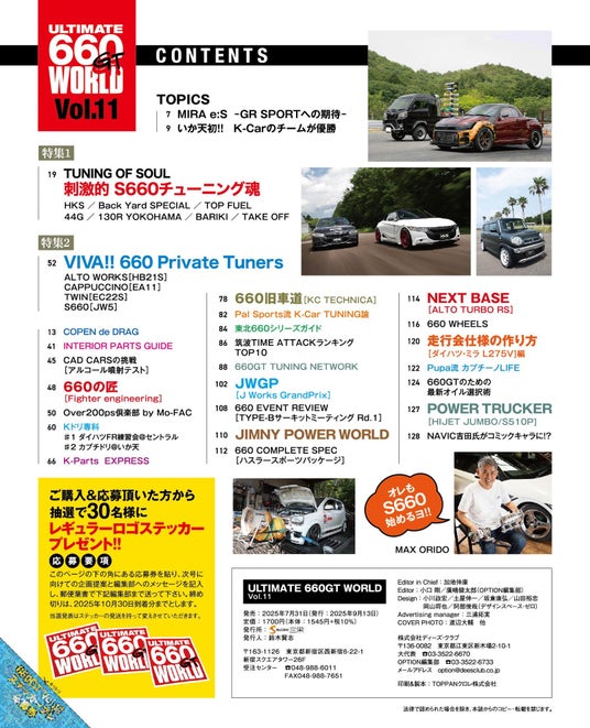 オプション編集部が製作する、K-Car(軽自動車)のスポーツ系チューンとカスタムを楽しむことに特化した内容の雑誌です。新旧様々なモデルのK-Carのチューニング事例やパーツ、オーナー、イベントなどの内容がギッシリ詰まっていて、マニアにとっては実用性も高く、お買い得な内容となっております。