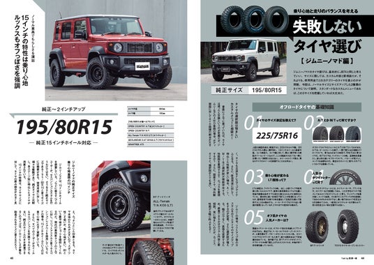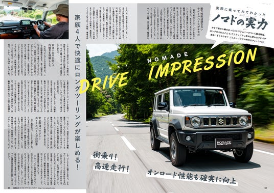 誌上では実際にジムニーノマドを一般公道、高速道路、ノーマルのオフロードなどステージ別の試乗インプレッションも掲載。ロングホイールベース化がどんな乗り味を作り出すのか、ノマドの実力を徹底チェック