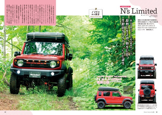 ジムニーノマドをよりタフに、ワイルドにカスタマイズしたモデルも掲載。高い悪路走破性に荒野をも快適なキャンプ地とする居住性を兼ね備える唯一無二のモデル『エヌズリミテッド ジムニーノマド 南部仕様』も登場する