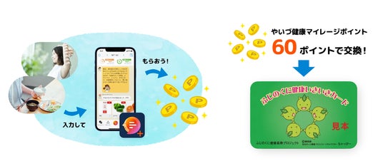 「カロママ プラス」 に食事や運動など日々の健康活動を記録すると、「やいづ健康マイレージポイント」が貯まります。