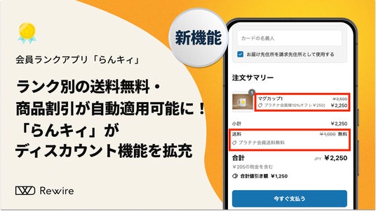ECシステムの技術支援を行う株式会社リワイア(本社:東京都港区、代表取締役:加藤英也、以下「リワイア」)が提供する会員ランクアプリ「らんキィ」において、特定の会員ランクにのみ適用されるディスカウントコードを自動適用する機能が拡充されました。従来の「注文」に加えて、「配送」「商品」にも対応いたします。本機能は、2025年6月5日のリリース(参考リリース)に続く第二弾アップデートです。