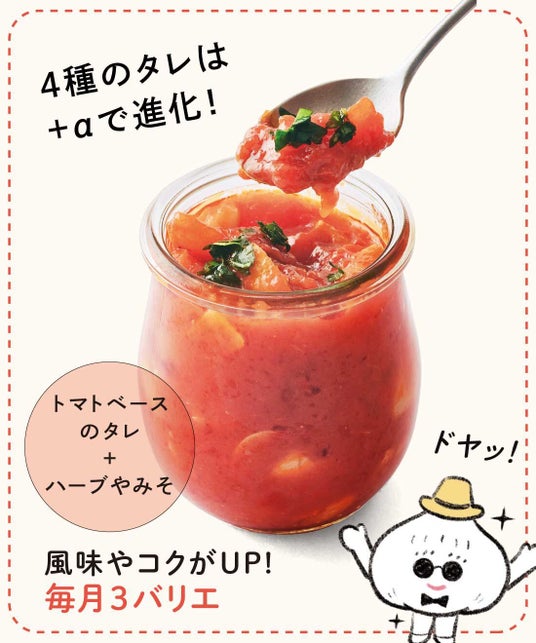 4種のタレはそのまま楽しむだけでなく、毎月3つのアレンジが紹介されます。例えば、にんにくトマトソースにハーブやみそをプラスして、風味やコクを上げるなど、その日のメニューや気分に合わせて変化を楽しむことができます。
