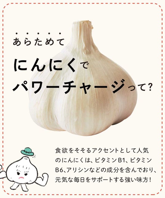 食欲をそそるアクセントとして人気のにんにくは、ビタミンB1、ビタミンB6、アリシンなどの成分を含んでいます。にんにく万能ダレはおいしいだけでなく、元気な毎日をサポートしてくれる強い味方です。