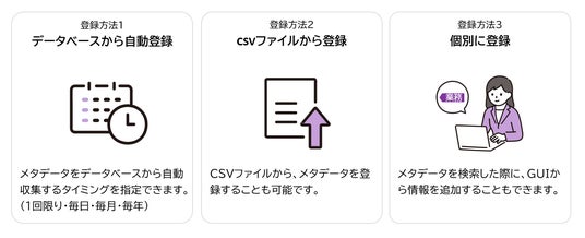 既存データベースからの自動収集に加え、CSVやGUI操作による登録も対応。