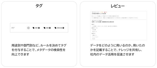 タグ付けルールで分類を整備し、レビュー機能でデータの活用事例や注意点を共有。
