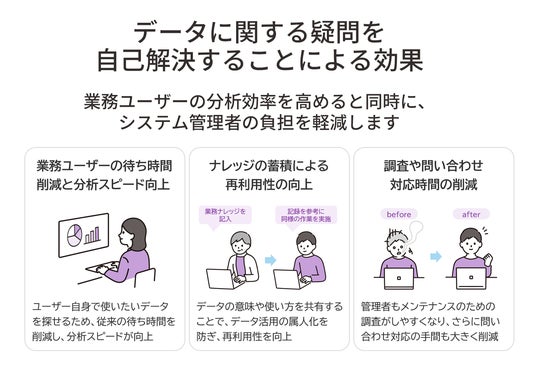 DataHarborを活用することで、データに関する疑問をユーザー自身で解消できるようになり、業務の効率化とナレッジの共有が促進されます。分析作業のスピード向上に加え、属人化の抑制や問い合わせ対応の削減といった効果が期待でき、組織全体でのデータ利活用を加速させます。