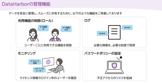 DataHarborでは、ユーザーごとの権限設定や操作ログの記録、利用状況のモニタリングなど、管理者向けの機能も充実しています。パスワードポリシーの設定やロールによる機能制御も搭載されているため、セキュリティやガバナンスに配慮した運用が可能です。