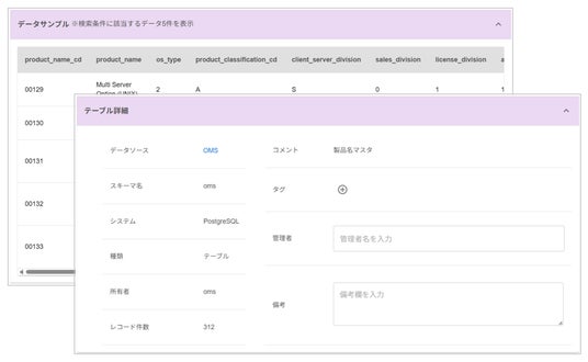 テーブルやカラムの説明、データのサンプル、関連情報をすぐに確認可能。