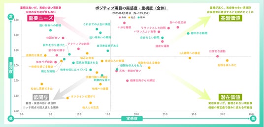 「TOTONOID」では、ウェルビーイングに対してポジティブに影響する項目とネガティブに影響する項目の全72項目について、重視度(幸福であるために重要であると考えているか)と実感度(その項目が現在の自身の状態に該当すると実感しているか)を聴取します。2025年4月、Ponta会員13万人に実施した調査の結果をポジティブ項目、ネガティブ項目ごとにプロットしました。ポジティブ項目では、重視度は高いが、実感度は低い項目群を「重要ニーズ」と定義しています。重要ニーズ群では「遠い将来への期待」が最も高く、一方で「他人との交流」は重視度、実感度ともに最も低い「低関与」群にマッピングされました。これを活用し、例えば、商品のキャッチコピーを「他人との交流」を訴求するものから、「遠い将来への期待」につながるものに変更するなど、生活者の気持ちや状態をとらえたマーケティング施策の展開をサポートします。