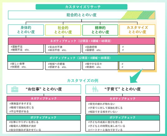 身体・社会・精神のととのい度に加えて、仕事や子育てなど、ご希望の領域の「ととのい度」の聴取を追加し、個別の目的に応じた設計でアンケートを実施できます。