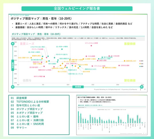 Ponta会員に聴取したデータを、ダッシュボードや資料にまとめました。性年代や居住地、年収、性格など、さまざまな属性で「ととのい度」を把握できます。「TOTONOID」のアンケートでは、ウェルビーイングに対してポジティブ・ネガティブに影響する項目として、睡眠の質、バランスのよい食事、社会的孤立感、自己肯定感、支出に関する不安など、全72項目を聴取し、その結果をご覧いただけます。